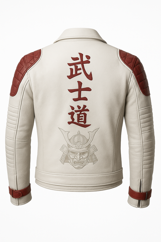 Samurai Bushido Leather Biker Jacket – Premium Off-White & Red Armor by Zeekstar