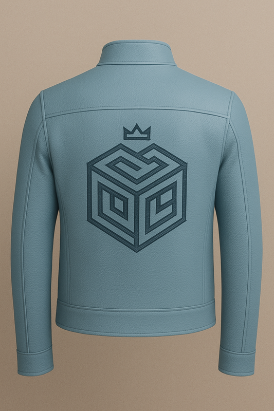 Sky Blue Leather Jacket for Men with Bold Geometric Back Embroidery