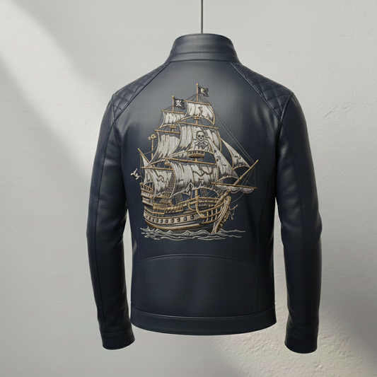 Men’s Navy Leather Jacket with Embroidered Ship & Compass Design
