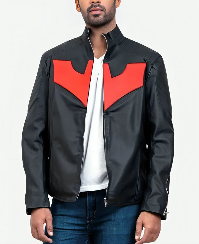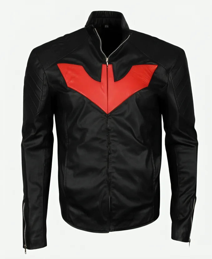 Crafted from premium-grade genuine leather, this jacket exudes luxury and durability. Its sleek black finish is accented with the signature red Batman Beyond emblem on the chest — symbolizing power, courage, and the spirit of justice. The athletic fit ensures comfort and flexibility, perfect for both casual wear and cosplay events.