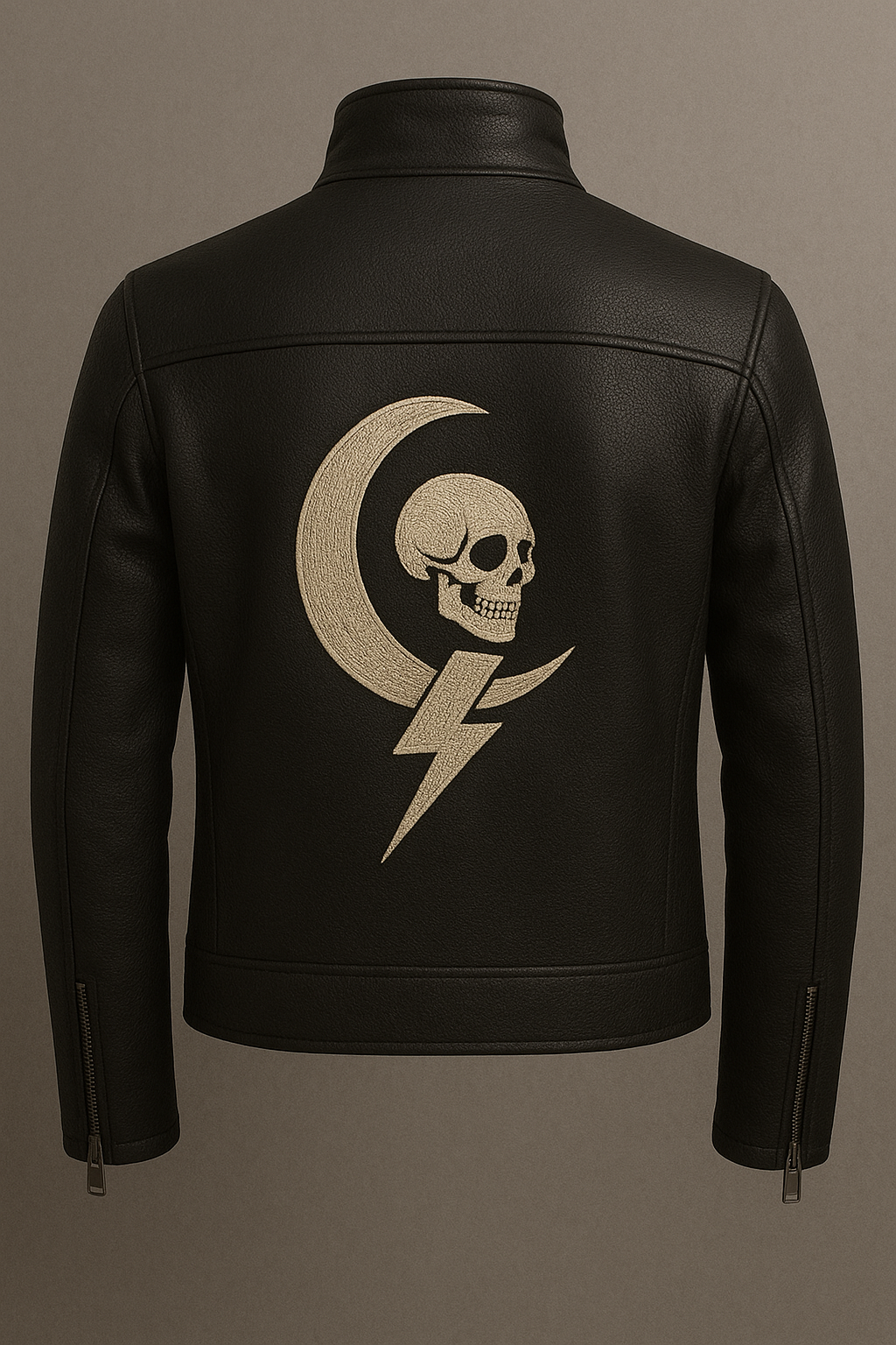 The standout element lies on the back: a meticulously embroidered skull, crescent, and lightning design, symbolizing confidence, power, and fearless individuality. This bold artwork transforms the jacket into a true showpiece, making it impossible to blend in.